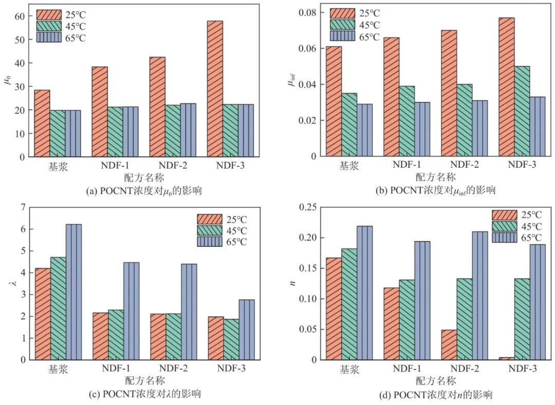 Hajiabadi等通过比较不同流变模式的流变参数,重点探讨了不同温度条件下聚乙二醇改性的碳纳米管POCNT加入油基钻井液中的流变行为。以优选出Carreau模式计算得出的相关参数为例(图12),在25℃下,添加6g的POCNT的钻井液样品(NDF-3)的零剪切速率黏度(µ0)增加至57.6mPa·s,而基浆为28.4mPa·s。无穷剪切速率黏度(µinf)从0.06mPa·s增加至0.08mPa·s。在45℃和65℃下,也观察到了类似的趋势,其中,45℃时NDF-3样品的µ0从基浆的19.9mPa·s增加至22.3mPa·s,µinf从0.03mPa·s增加至0.05mPa·s。POCNT的添加显著改善了钻井液的流变性能和剪切稀释性,有助于提高钻屑携带能力和井眼清洁效率。
