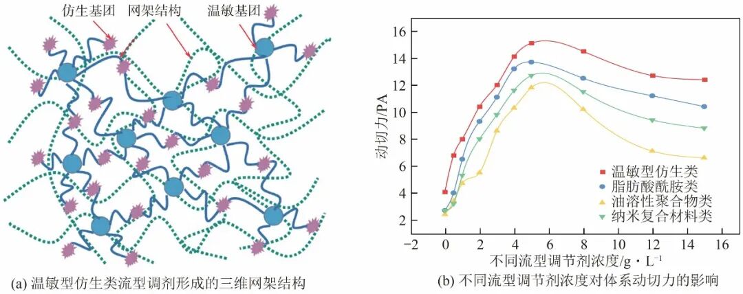 利用超分子化学与智能材料学理论,蒋官澄团队在合成过程中引入了带冠醚的温敏基团和氨基仿生基团,制备了一种依靠氢键作用形成三维网络结构的仿生温敏型流型调节剂,并比较了几种常见流型调节剂的浓度对动切力的影响,如图8所示。与常用的脂肪酸酰胺类、油溶性聚合物类和纳米复合材料类流型调节剂相比,该温敏型仿生流型调节剂在相同浓度下具有最好的提高动切力效果,能够实现无土相、克服固相损害,提高钻井液动切力,并避免出现增稠的现象。