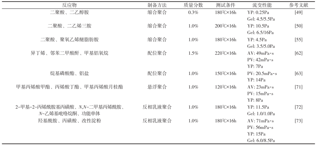 1929年,Carothers提出了一个粗略但普遍适用的聚合物分类方法——缩聚物和加聚物。基于此分类,合成聚合物制备方法可以分为缩合聚合反应和加成聚合反应两大类。缩合聚合反应可以通过两个或更多反应性基团的单体而形成,这些反应性基团的特征是分子间能缩合在一起,产生聚合物并消除副产物(通常是水)。缩合聚合主要根据聚合单体的名称或者产物的名称进行分类。如聚酰胺类流型调节剂是一类由二聚脂肪酸和多元有机胺缩合制备的聚酰胺类物质,缩合反应的特点决定了伯胺基、仲胺基和酰胺基等极性基团在聚合物分子中均匀分布。加成聚合则是将引发剂加入到单体中,引发链式反应,形成聚合物。加成聚合又可以具体分为自由基聚合、悬浮聚合、乳液聚合、离子聚合和配位聚合等类型。由于聚合物制备方法众多,本文总结了油基钻井液常用合成聚合物流型调节剂的制备方法及其流变性能,见表2。