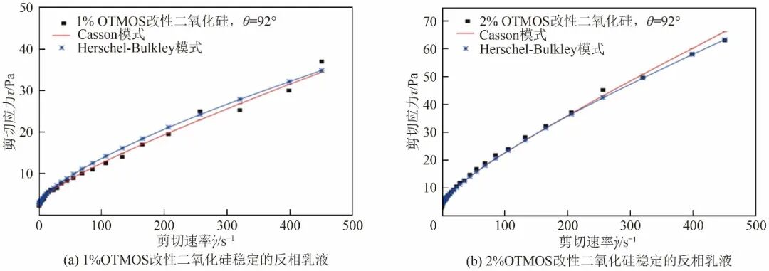 近年来,有机/无机复合材料凭借其优异的机械性、热稳定性以及功能集成性等方面的显著优势,成为油基钻井液流型调节剂研究与应用的热点。Mikhienkova等研究了不同浓度聚二甲基硅氧烷改性的二氧化硅纳米颗粒对油基钻井液中流变性的影响,在纳米颗粒质量分数较低(0.25%和0.5%)时,油基钻井液的切力和黏度相比于未添加纳米颗粒的钻井液几乎没有变化。然而,当纳米颗粒质量分数提高到1%和2%时,切力和黏度显著增加,在170s-1的剪切速率下,1%和2%纳米颗粒质量分数下的切力分别增加了5%和23%。硅烷有机改性纳米二氧化硅颗粒也被用来作油基钻井液流型调节剂,在对钻井液流变行为的研究中,选择合适的流变模型对数据进行拟合至关重要。如图11所示,分别对1%和2%的OTMOS改性二氧化硅制备的反相乳液进行流变模式拟合,Casson模式和Herschel-Bulkley模式均可较好地拟合流动行为,Casson模式拟合得到的屈服应力分别为2.2Pa、2.9Pa,塑性黏度为分别0.04Pa·s、0.09Pa·s,Herschel-Bulkley模式的拟合参数屈服应力分别为2.7Pa、4.0Pa,塑性黏度分别为0.42Pa·s、0.52Pa·s,幂律指数分别为0.71、0.78。