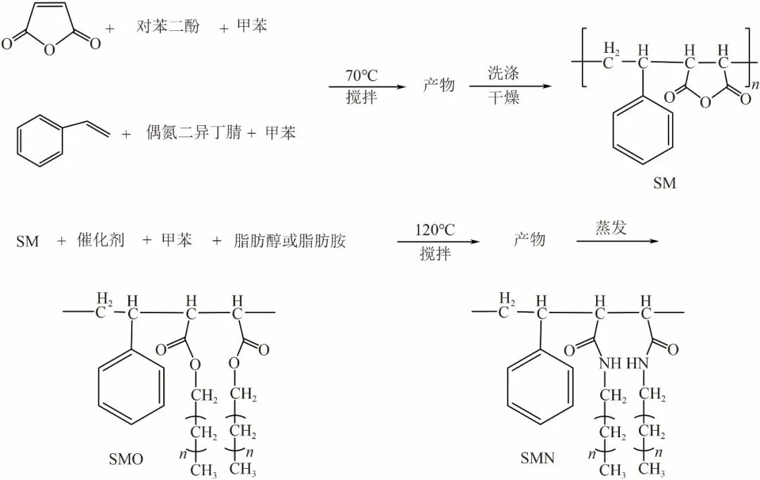 不同类型的流型调节剂复配使用能获得协同的流型调节效果。Zhou等制备了聚酰胺(SMN)和聚酯(SMO)两种聚合物作为油基钻井液流型调节剂,合成路线如图9所示。SMN和SMO是具有层状结构的亲脂性聚合物,能完全溶解在柴油中,长碳链的纠缠和偶极-偶极子吸引形成的氢键改变了柴油的空间结构,从而形成了网状结构。He等以聚脂肪酸和聚醚胺为原料,得到两亲性多嵌段聚合物HTR-GA,有效改善了高密度(2.2g/cm3)油基钻井液在高温下的流变性能,220℃老化24h后,动切力超过10Pa,老化96h后,动切力依旧保持在4Pa以上。谢涛等将合成的双亲性多嵌段共聚物流型调节剂HT-TQ、油溶性小分子凝胶剂HT-CB和悬浮增效剂海泡石复配,评价其对乳液流变性的影响;综合分析结果显示,HT-TQ主要在增强动切力以及低剪切速率下的黏度和剪切力方面表现出显著效果,而HT-CB则侧重于提升静切力和改善触变性,海泡石纤维进一步增强了网架结构的整体强度。三者协同作用,在基础乳液中形成了高强度的空间网架结构,为构建超高温下具有长效悬浮稳定性的油基钻井液体系奠定了基础。