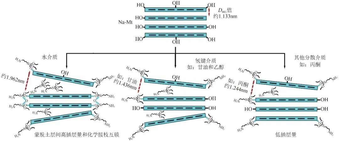 Asgari等使用γ-氨丙基三乙氧基硅烷对蒙脱石进行改性,比较了不同溶剂中γ-氨丙基三乙氧基硅烷对蒙脱土接枝效率的影响,如图5所示。就嵌入和化学接枝的硅烷量而言,水介质比其他有机介质更有效。水分子允许更多的硅烷分子进入到黏土的层间空间。然而,由于水分子与亲水蒙脱石片层之间存在强偶极子,硅酸盐结构在干燥过程后收缩,可能导致蒙脱石片层之间通过接枝的硅烷偶联剂与相邻的片层之间发生交联。在干燥过程中,当多余的水从层间流出时,剩余的水偶极子将硅酸盐片层固定在一起。因此,改性黏土最终形成刚性收缩晶体结构。使用如甘油、乙醇或乙二醇等介质时,形成一个在边缘接枝硅烷并在层间形成插层的层状结构(硅烷在水、甘油、乙醇和乙二醇介质中的插层量分别为1.582mmol/g、1.480mmol/g、1.308mmol/g和1.262mmol/g黏土),这与通过XRD分析计算的d001值一致(硅烷在水、甘油、乙醇和乙二醇介质中d001值分别为1.96nm、1.44nm、1.40nm和1.34nm)。在有机介质如丙酮、甲苯、THF和DMF中分散时,硅烷在层间分布更少,d001值较低。李树白等利用阳离子表面活性剂以及硅烷偶联剂对蒙脱土复合改性,制备的有机土可抗温至200℃。潘越初步探索了使用硅烷偶联剂KH-550改性有机土并测定了油基钻井液性能参数,结果发现经过KH-550改性的钠蒙脱土对钻井液的流变性能并没有显著改善作用。