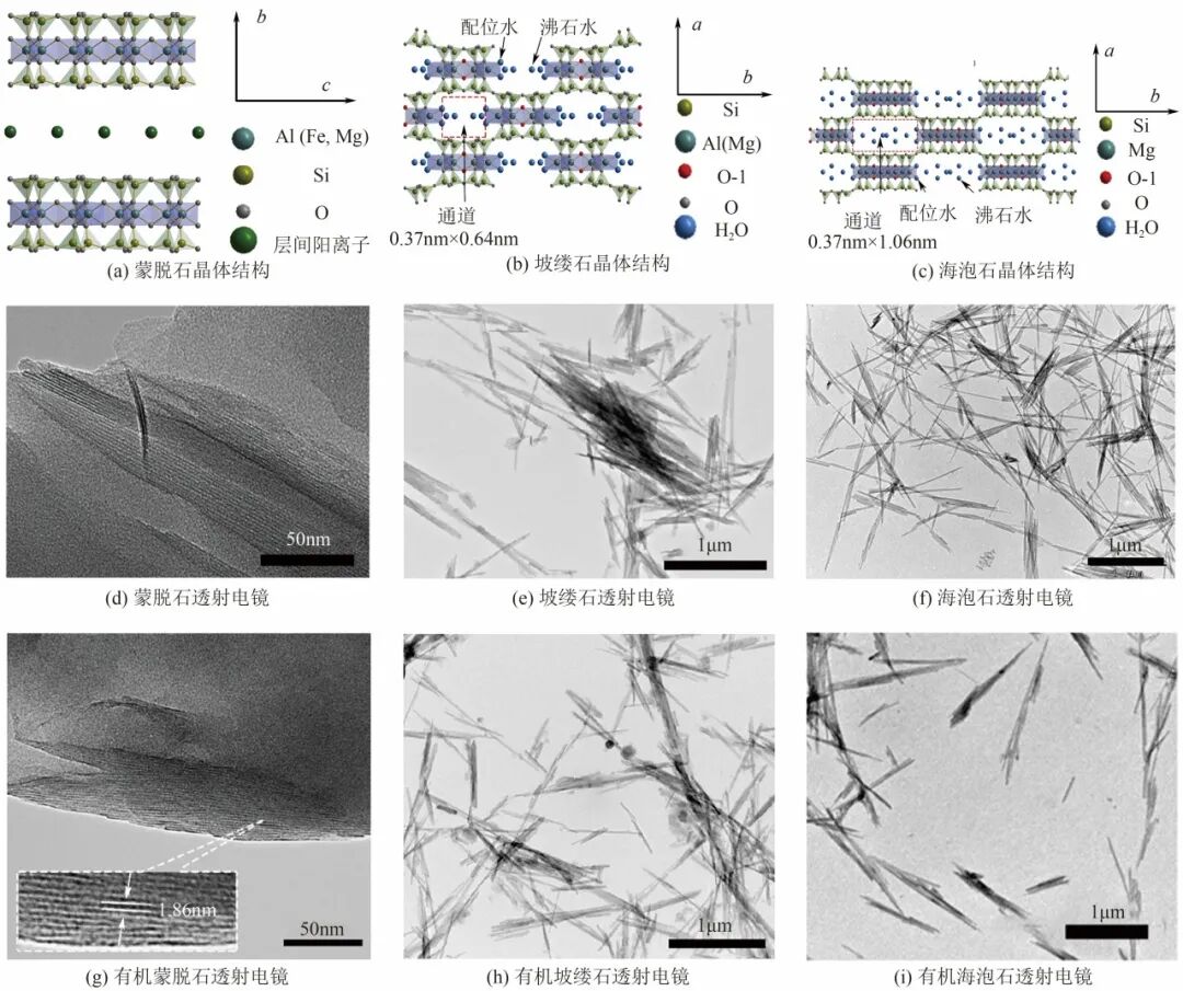 蒙脱石、海泡石、坡缕石的晶体结构及其原始和有机改性后的透射电镜图