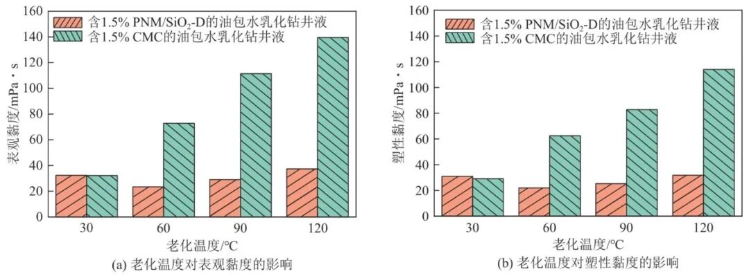 老化温度对含CMC或PNM/SiO2-D纳米杂化物的W/O乳化钻井液(水油比4∶6)表观黏度和塑性黏度的影响