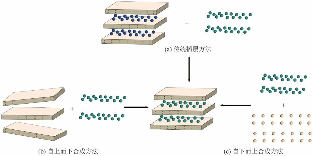 插层改性方法主要包括传统的插层方法、自上而下的方法和自下而上的插层方法3种(图3)。传统的插层方法通常利用扩散、离子交换、分子间作用力、酸碱反应、电化学和氧化还原反应将物质插入层状材料[图3(a)]。自上而下的合成策略通常使用剥离的二维材料作为前体组装插层复合材料[图3(b)]。在自下而上的插层中,插层相与层状相的合成在单个反应中耦合。前体可以是分子或离子反应物,也可以是固态结构,它们与插层剂共同反应生成插层产物[图3(c)]。