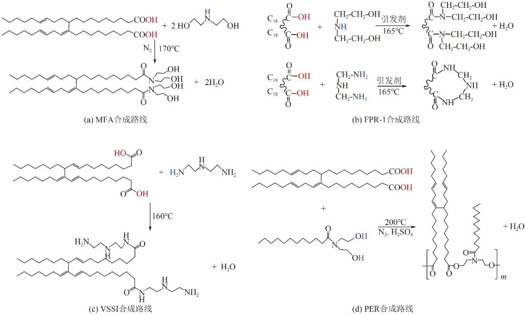 孙伟等以二聚酸、二乙醇胺、二乙烯三胺为原料,通过四元共聚法制得了油基钻井液提切剂FPR-1,合成路线如图7(b)所示,在油水比8∶2的条件下,加入2%的FPR-1动切力达到13.2Pa,在220℃老化16h后,观察到钻井液有软沉现象,但动切力依然维持在11Pa以上。为了克服聚酰胺类流型调节剂在合成过程中变得黏稠、反应后期体系生成的水不易排出导致反应不彻底、黏度大易受热不均匀导致局部过度交联出现固化生成固态的酰胺树脂等问题,王伟等采用三乙二醇单丁醚做溶剂,二聚酸和二乙烯三胺为原料制备了流型调节剂VSSI[图7(c)],在120℃下老化16h,冷却至60℃后测定其流变性能,与流型调节剂PF-MOD和聚苯乙烯树脂相比,加入VSSI的油基钻井液动切力提升了1倍。蒋官澄团队以二聚酸和椰子油脂肪酸二乙醇酰胺为原料,得到了恒流变流型调节剂PER[图7(d)],当钻井液密度为1.2g/cm3时,动切力、Φ6、Φ3、初切力、终切力随温度的变化率均小于20%,表明钻井液具有优异的恒流变性。