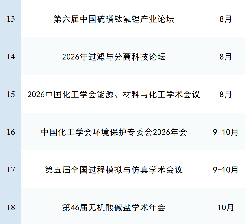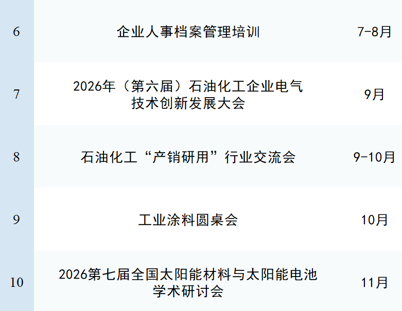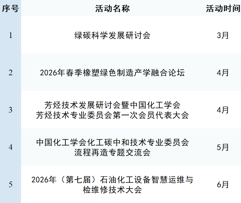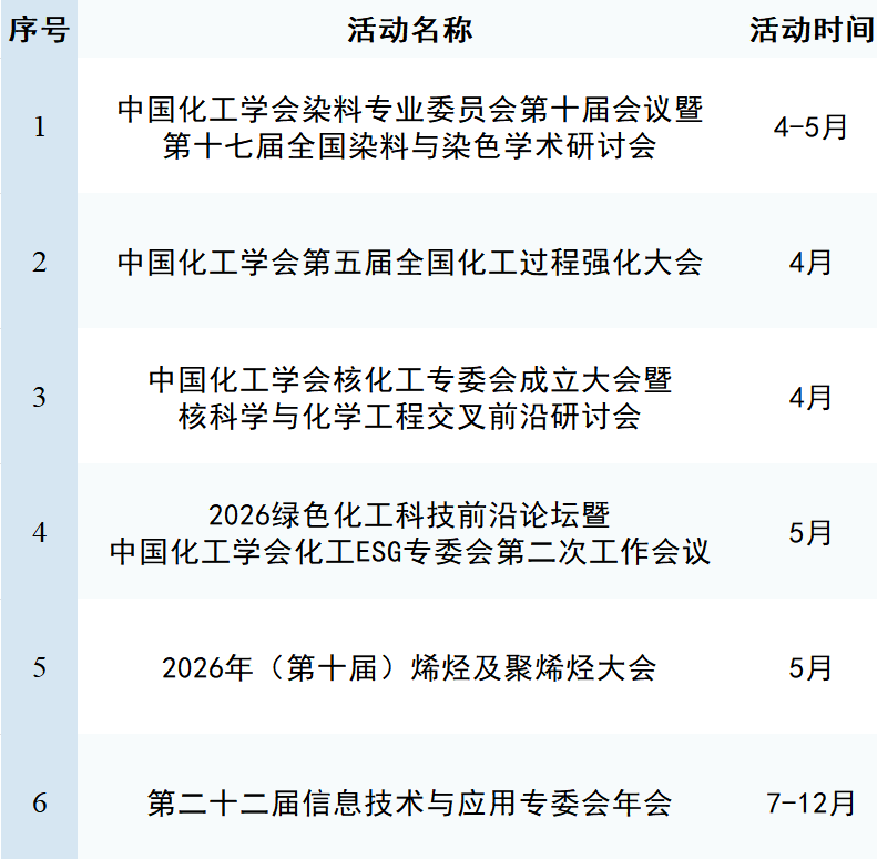 为进一步培育系列化、高水平、特色化的学术会议,打造具有影响力的学术交流品牌活动矩阵,现按照《中国化工学会学术会议管理办法》的规定要求,经学术指导委员会审定,编写《2026年中国化工学会重点学术及产业交流活动计划》共计66项,现予以发布。