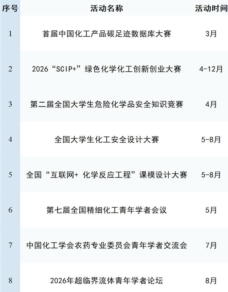 期待您关注中国化工学会全年重点学术活动。具体活动信息可能依照实际情况及时调整,请关注“中国化工学会”官网或微信公众号获取最新动态。